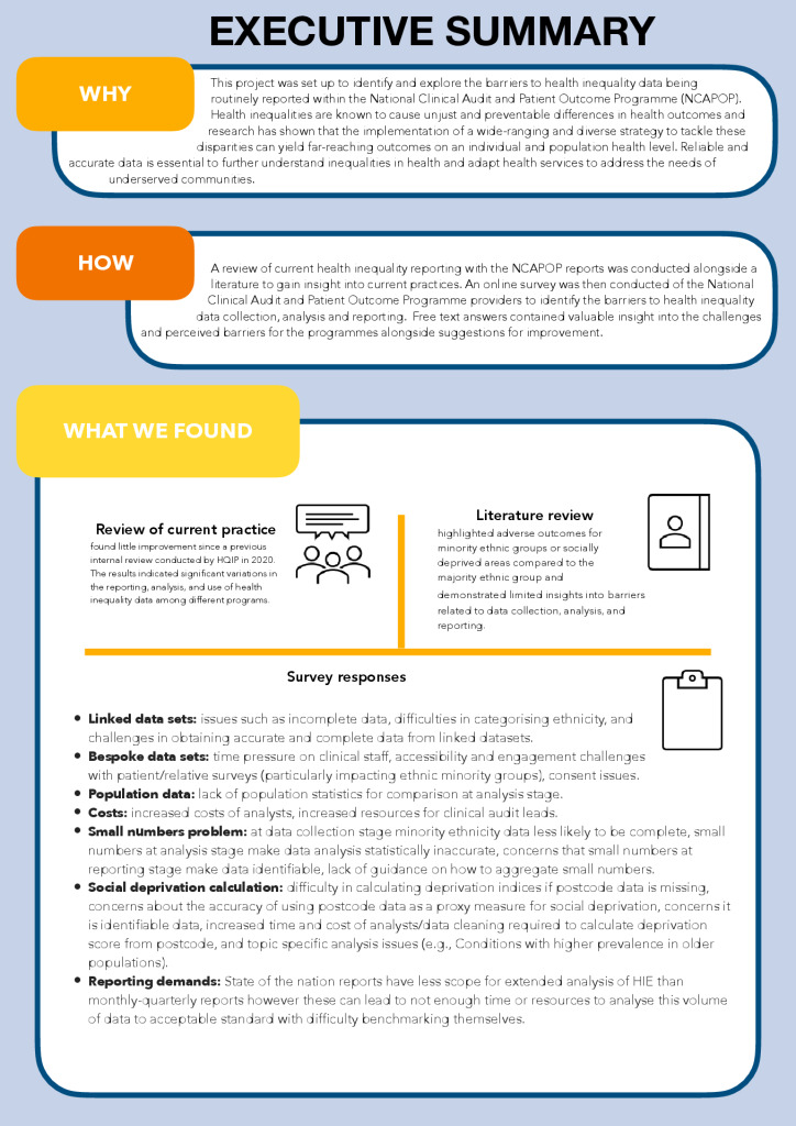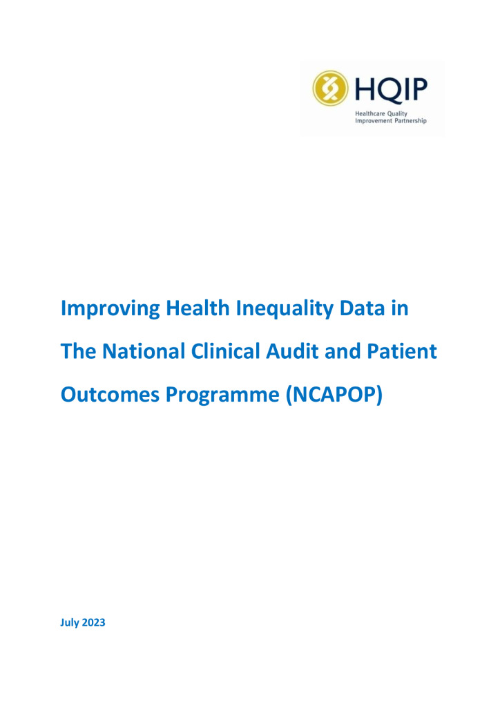 This report is the result of a project to identify and explore the barriers to health inequality data being routinely reported within the National Clinical Audit and Patient Outcome Programme (NCAPOP), which is commissioned by HQIP on behalf of NHS England and the Welsh Government. This is a matter of critical importance since health inequalities are known to cause unjust and preventable differences in health outcomes. Research has shown that the implementation of a wide-ranging and diverse strategy to tackle these disparities can yield far-reaching outcomes on an individual and population health level. As such, reliable and accurate data is essential to further understand inequalities in health and adapt health services to address the needs of underserved communities. Health Inequality Data in The National Clinical Audit and Patient Outcomes Programme (NCAPOP) found that there are significant variations in the reporting, analysis, and use of health inequality data among different programs. Despite this variation, survey responses identified the following recurring themes: