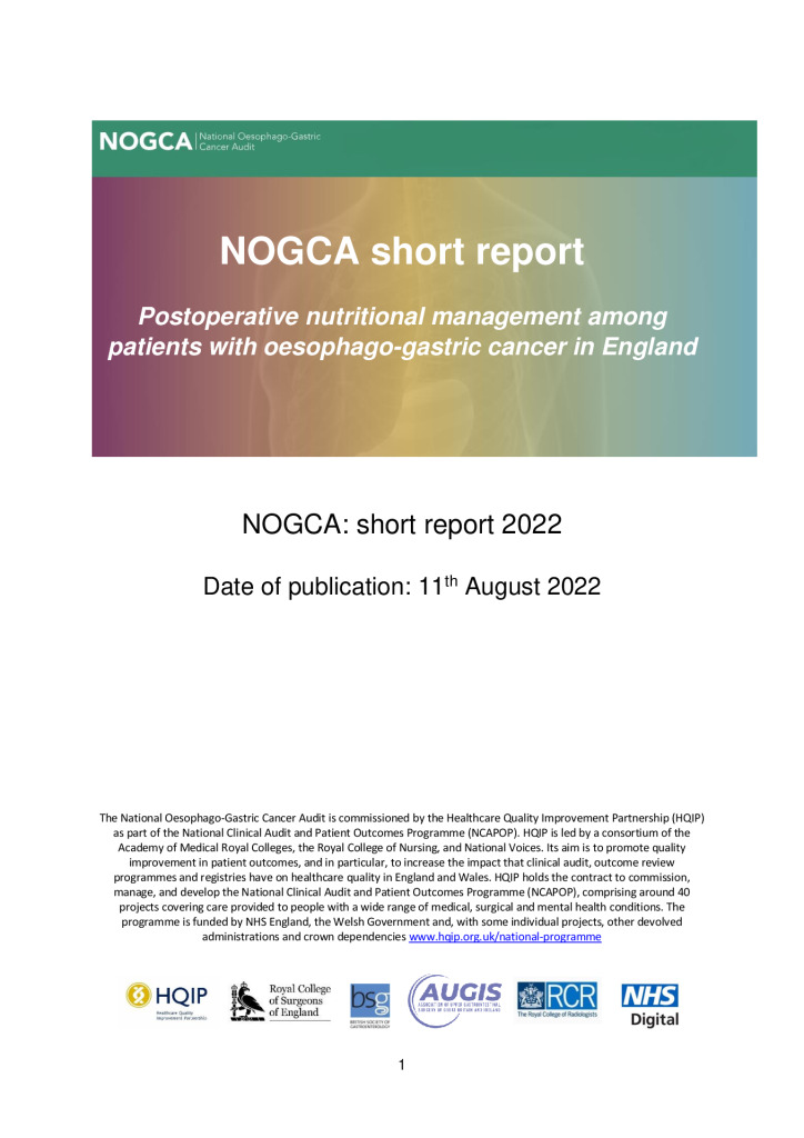 The National Oesophago-Gastric Cancer Audit (NOGCA) has published its latest short report, which provides insight into current postoperative nutritional practices in ten (27.8%) OG cancer specialist centres across England, based on 617 patients who underwent curative surgery after being diagnosed between April 2019 and March 2020.